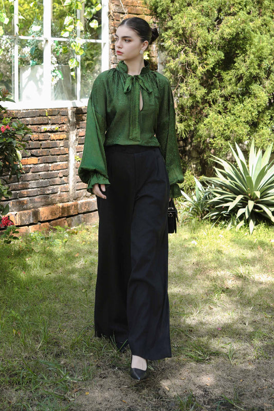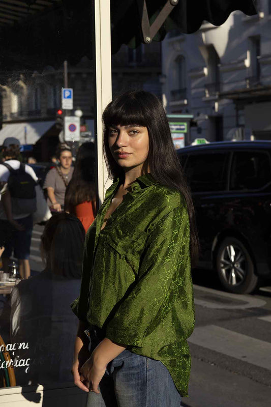 Green Brocade Silk Shirt – Oversized & Effortlessly Elegant