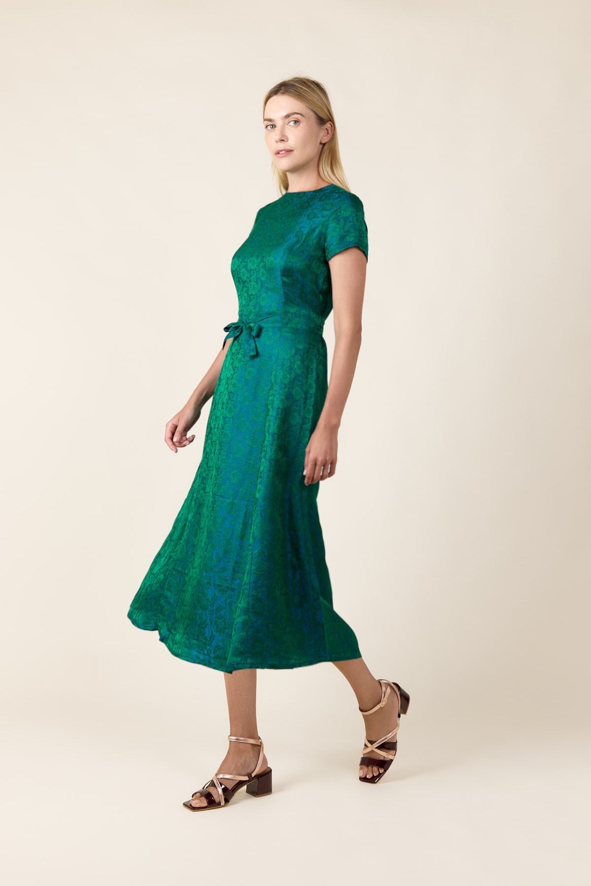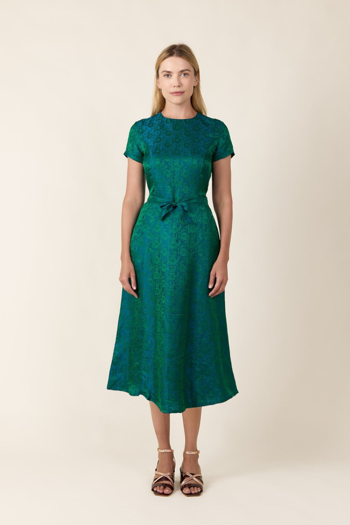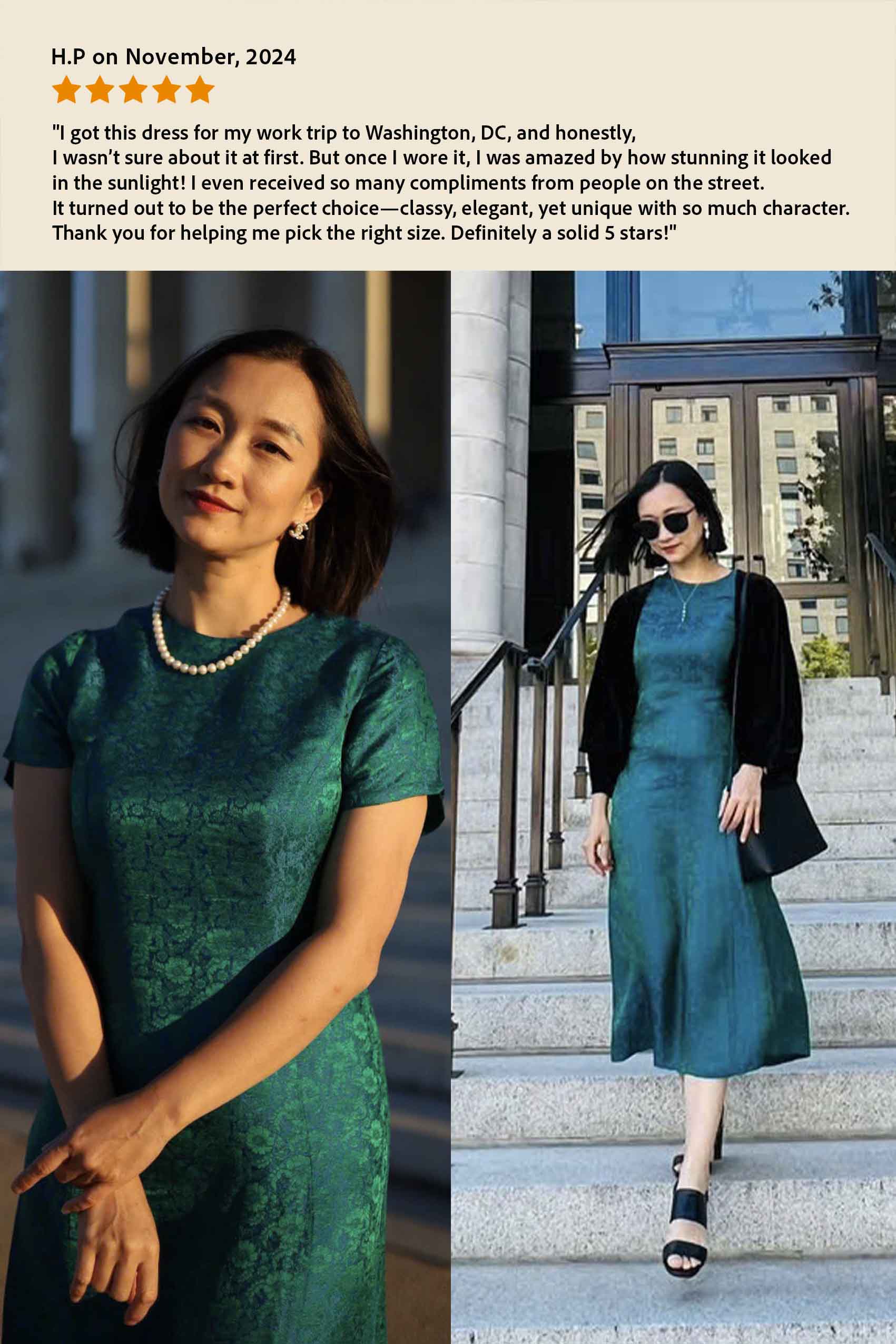 Our elegant silk dress is crafted from pure silk for a luxurious look. This silk formal dress features a chic round neck and short sleeves, punctuated by a long belt for a figure-flattering A-line silhouette and ribbon detail. As a formal silk dress, it effortlessly combines sophistication and style, making it perfect for any dress-code occasion. The flower silk dress design adds a delicate touch, enhancing its timeless appeal. Choose this round neck silk dress for an effortlessly sophisticated and elegant look.