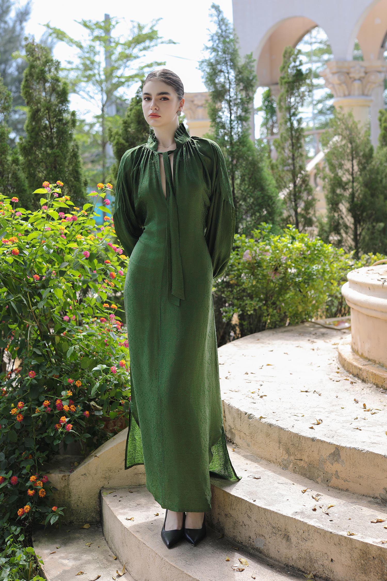 Crafted from the finest silk, this green silk dress boasts a natural sheen that captures the light beautifully, enhancing your every move. Silk is renowned for its breathable, lightweight, and smooth texture, making it an ideal choice for a dress that feels as good as it looks. Whether you're attending a formal dinner, a wedding, or a gala, this dress ensures you make an unforgettable impression.