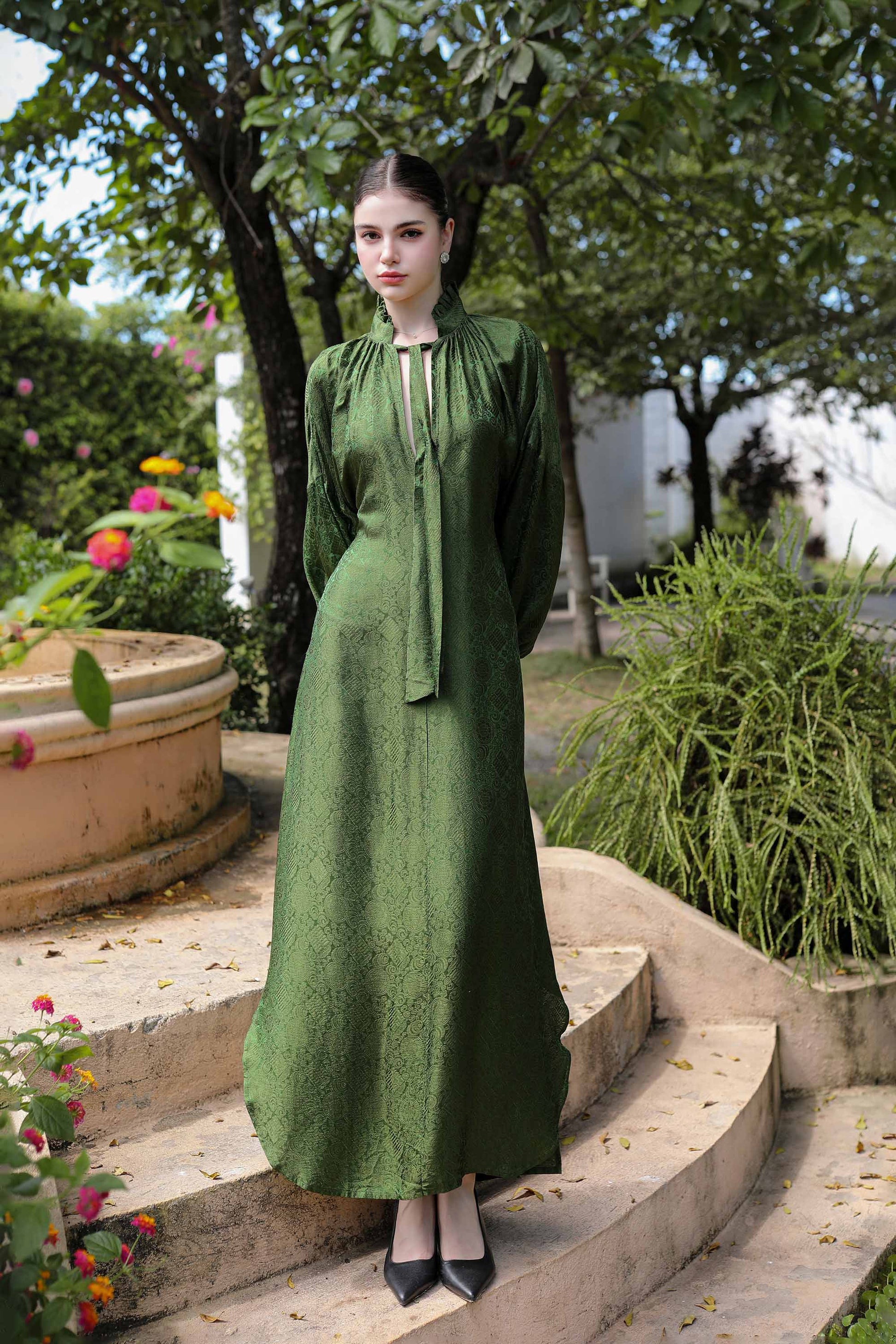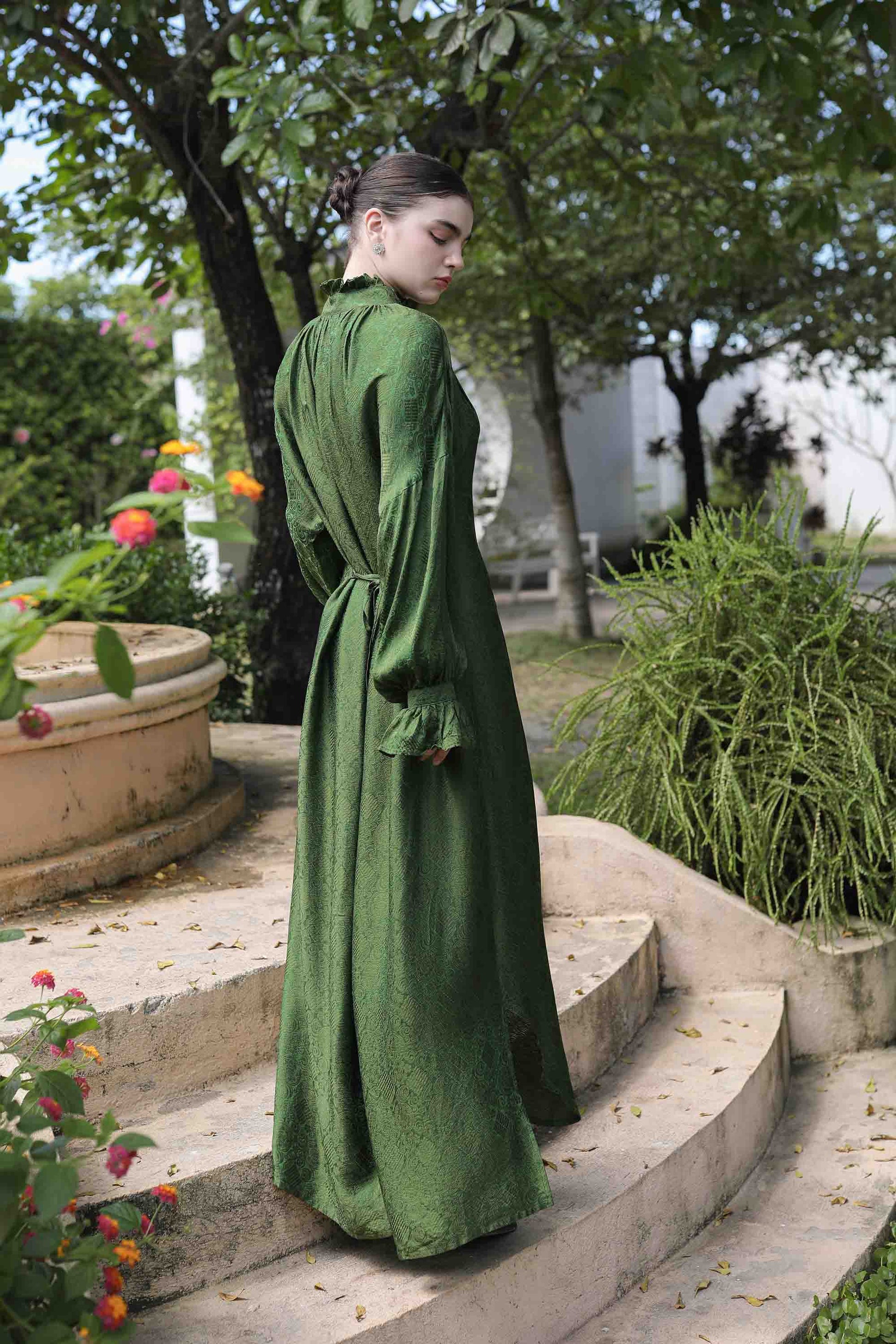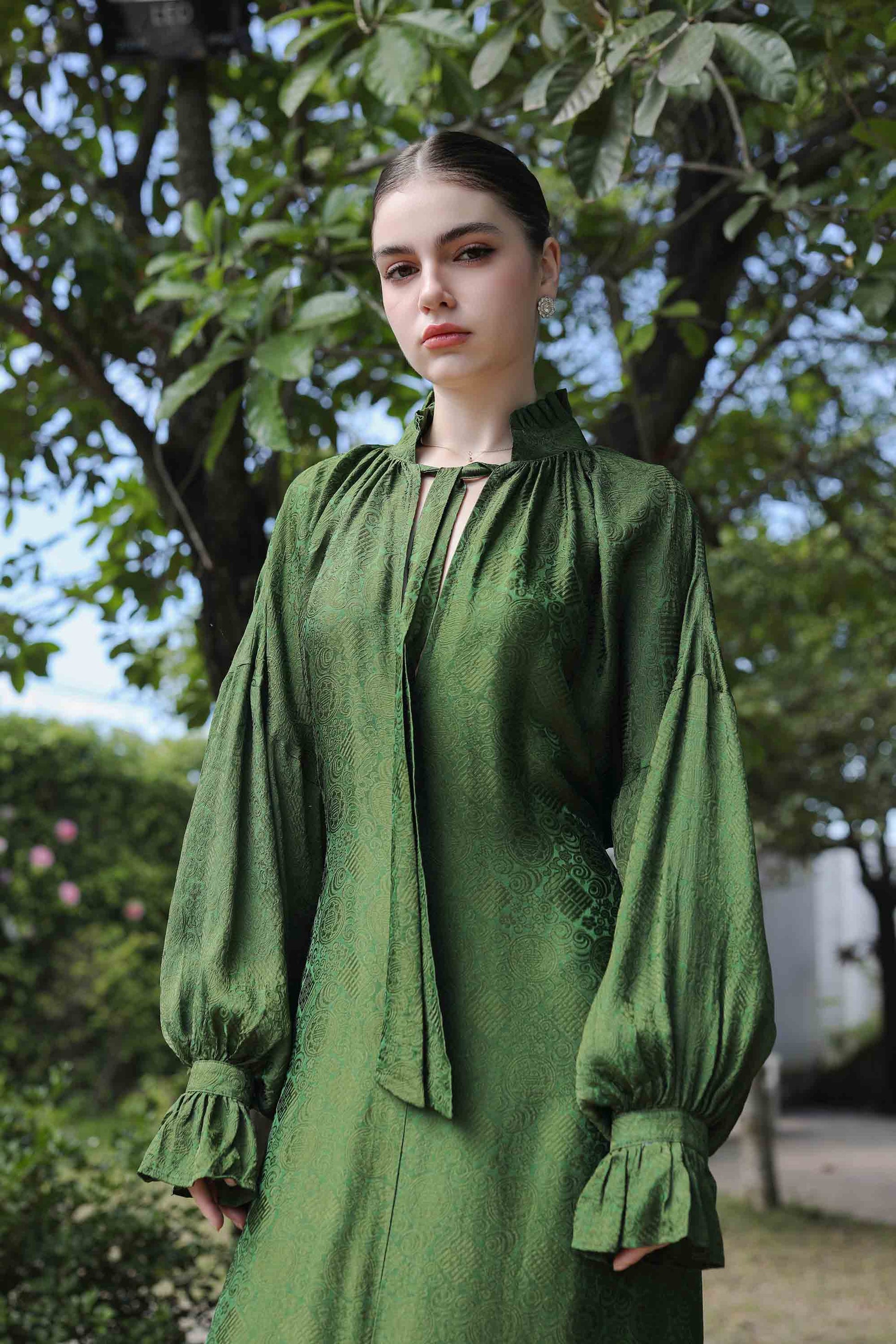 What sets this dress apart is its exquisite brocade detailing. The intricate patterns woven into the fabric add depth and texture, elevating this green brocade dress to a work of art. The brocade design is a nod to traditional craftsmanship, blending modern elegance with a timeless aesthetic. It's the perfect choice for those who appreciate unique, standout pieces in their wardrobe.