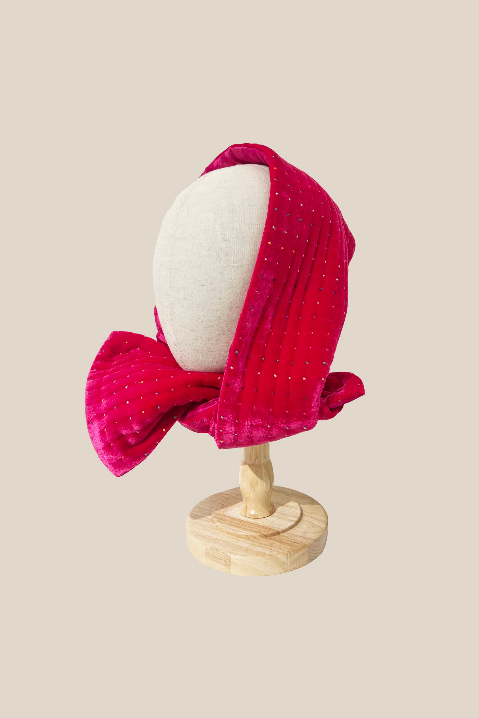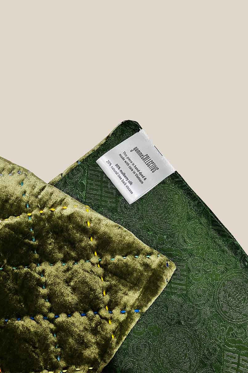 Each scarf is entirely handmade, with layers of silk velvet, silk lining, and soft cotton padding, quilted together by skilled artisans using time-honored techniques.