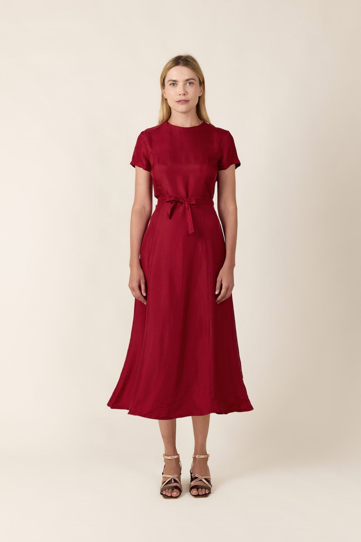 Our elegant silk dress is crafted from pure silk for a luxurious look. This silk formal dress features a chic round neck and short sleeves, punctuated by a long belt for a figure-flattering A-line silhouette and ribbon detail. As a formal silk dress, it effortlessly combines sophistication and style, making it perfect for any dress-code occasion. The flower silk dress design adds a delicate touch, enhancing its timeless appeal. Choose this round neck silk dress for an effortlessly sophisticated and elegant look.